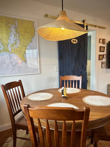 An over-the-garage addition with guest accommodations; newly built, with a nautical, 'always been there' feeling.